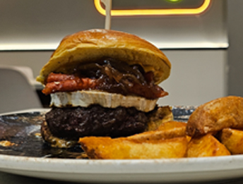 Pan Brioche o Artesano, Carne (a elegir 100% Ternera Gallega, Cachena Ecológica o Vaca Gallega), rulo de cabra, crujientes de chistorra, cebolla caramelizada y salsa la Peregrina