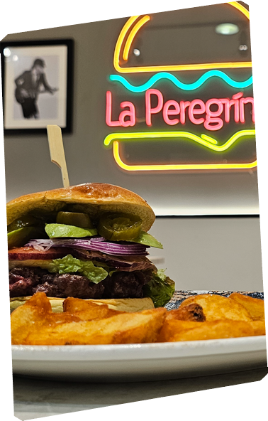 Pan Brioche o Artesano, Carne (a elegir 100% Ternera Gallega, Cachena Ecológica o Vaca Gallega),queso Cheddar, aguacate, tomate azul, cebolla crunch, jalapeños y salsa mejicana